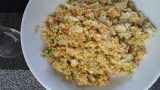 お豆腐に乾燥わかめを乗せたら、スプーンでぐじゃぐじゃにし、うま味調味料も入れてくずします。