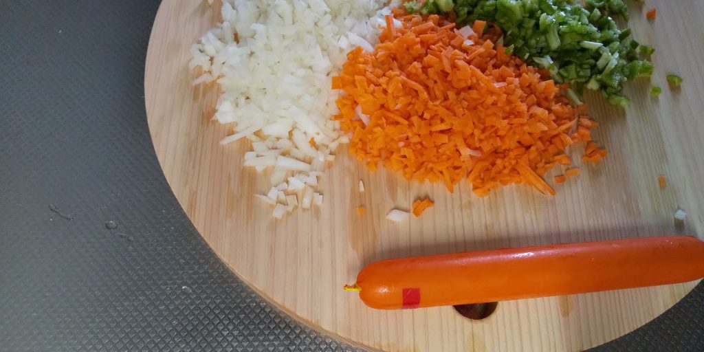みじん切りにします、魚肉ソーセージも。