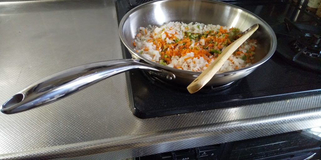 フライパンをあたため、油で材料を炒めます。