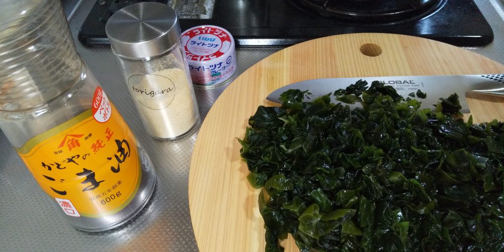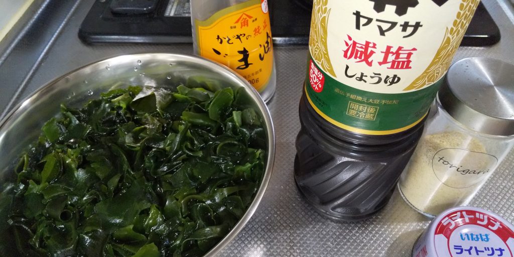 材料はわかめ 、ツナ缶、しょうゆ、ごま油、鶏ガラスープの素だけです。