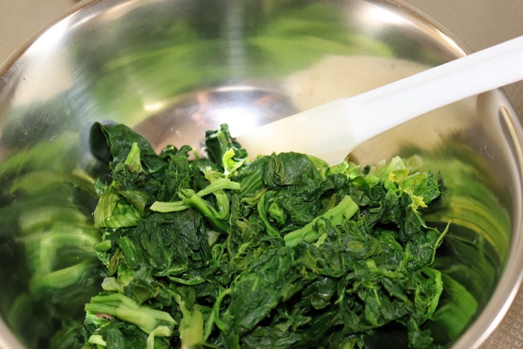 ちぢみほうれん草はよく洗い、茹でて水気を切ります。