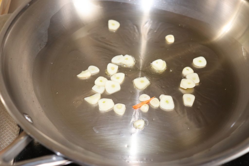 フライパンを温め、ニンニクを入れます。