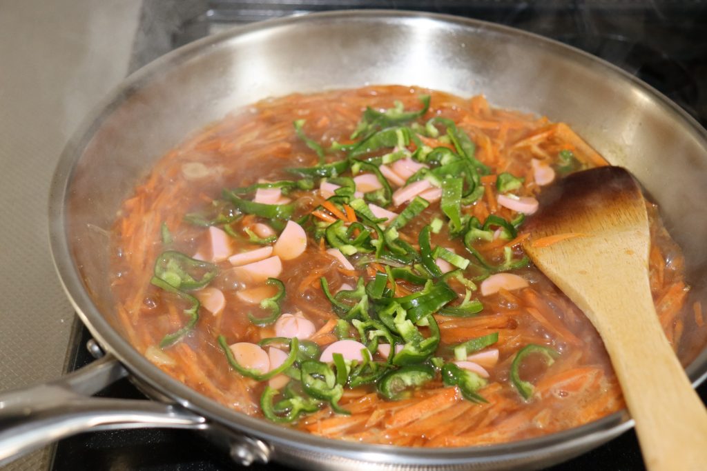 ピーマンと魚肉ソーセージも入れて、水分が少なくなったらソースを入れます。