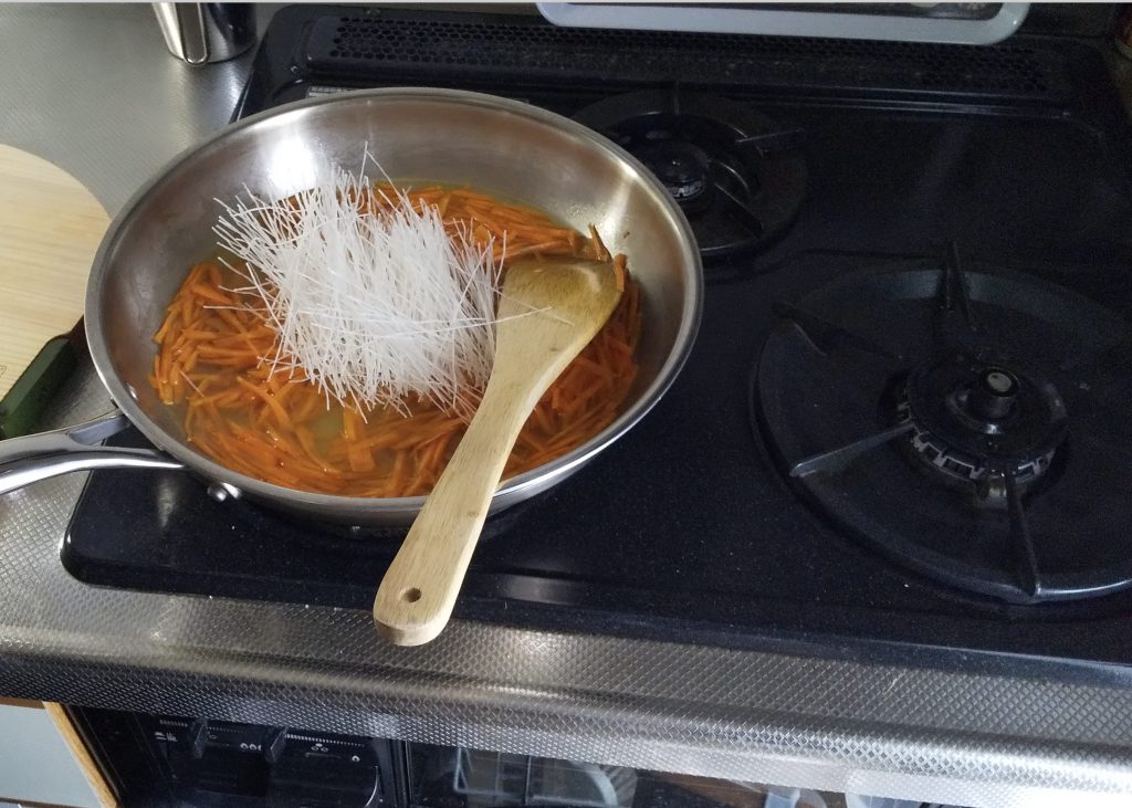 人参を炒め、しんなりしたら水300ccを入れて、春雨を入れます。